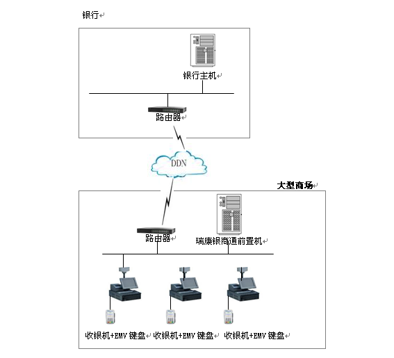 在本方案中通過在商戶收銀機上外接EMV密碼鍵盤或POS即可實現銀行卡受理,交易由商戶收銀系統(tǒng)發(fā)起,在EMV鍵盤或POS上完成銀行卡收單交易數據的采集,通過商戶內部網絡經由商戶與銀行的專線將銀行卡交易數據上送銀行處理,銀行處理完成后將交易數據返回到EMV鍵盤或POS終端,終端將把交易的結果反饋給商戶收銀系統(tǒng)完成交易。